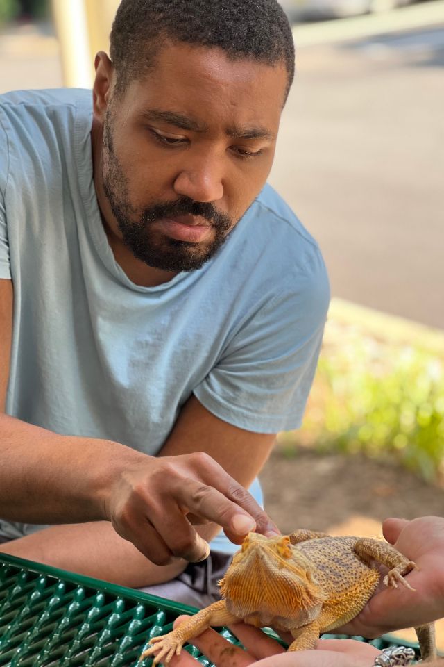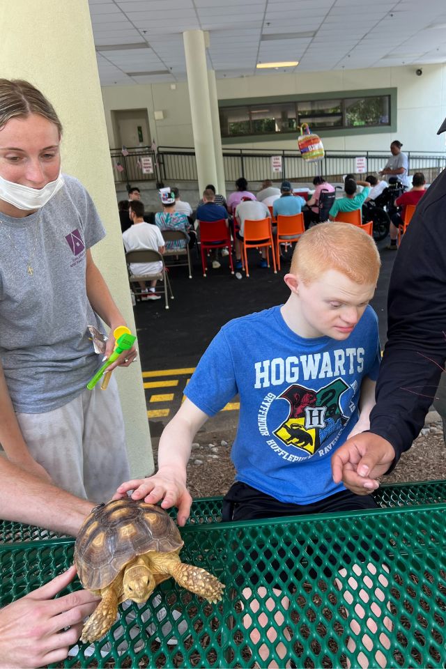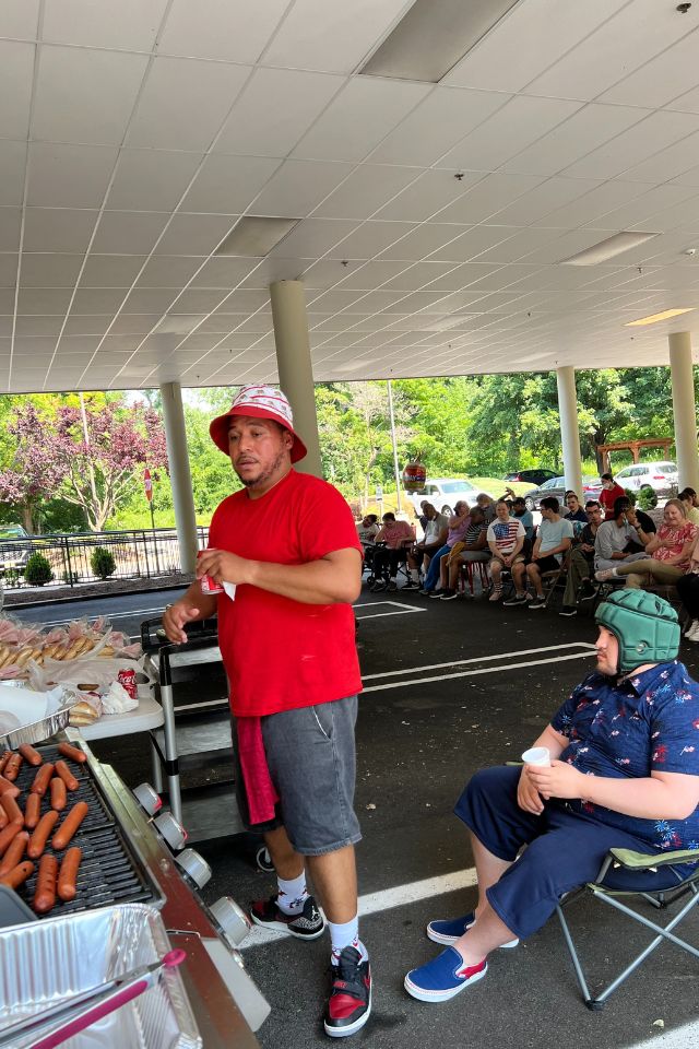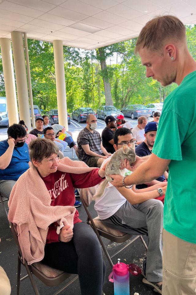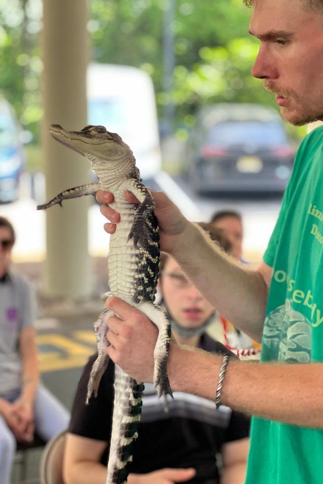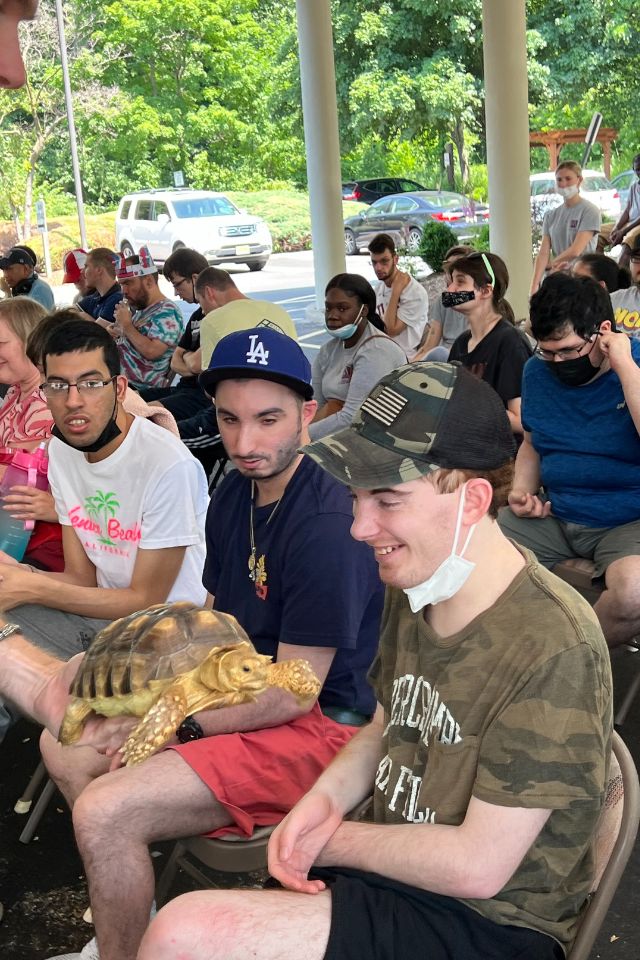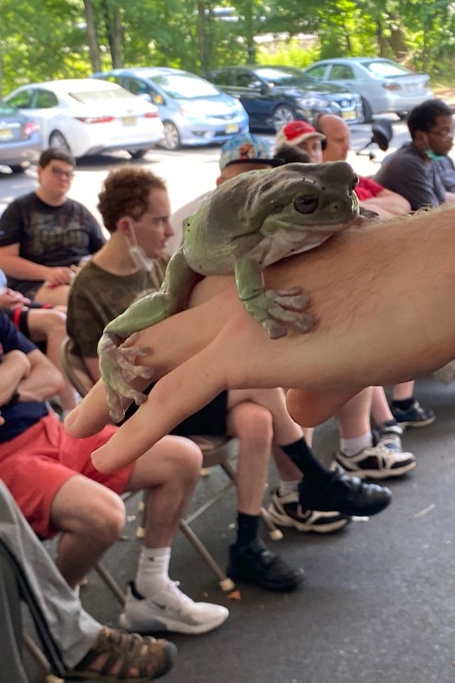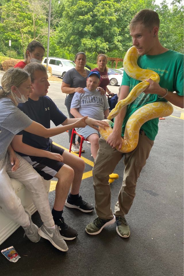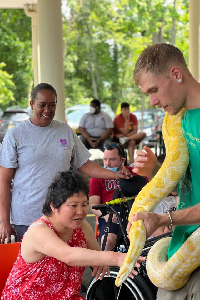 Members of STRIVE, our day program for adults with intellectual and developmental disabilities, celebrated July 4th with a Red, White and Blue barbeque. The members enjoyed music, delicious food grilled by Domingo Matos and a live show by Rizzo’s Reptile Discovery. STRIVE members hosted a bake sale to raise funds for the show and were so glad they did! The members met Pancake the frog, Pumpkin the snake, Grut the baby alligator and Sunny the enormous snake!